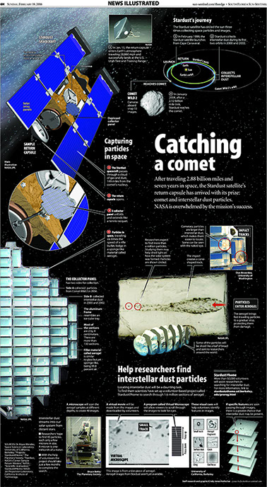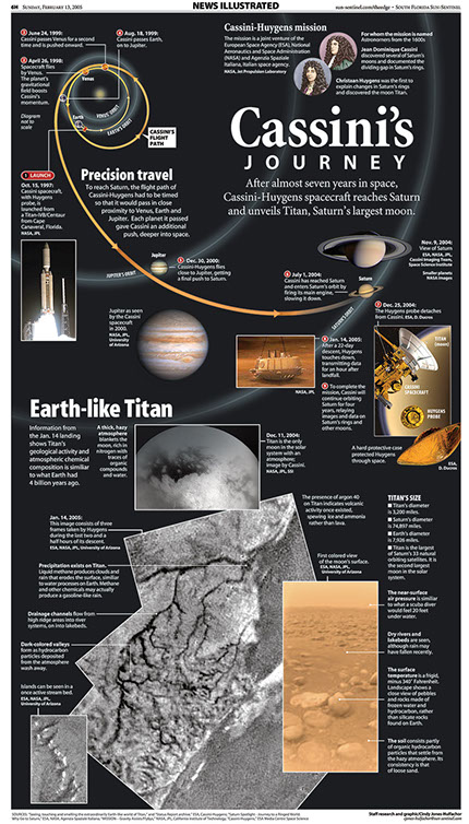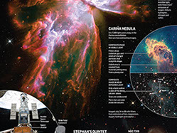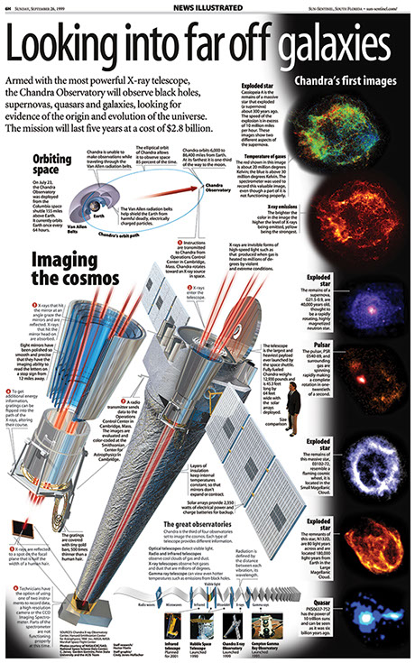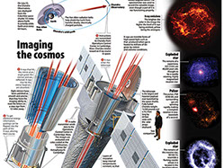 Beautiful NASA photos is a blessing for design. My goal was to give readers a design worthy of the awe inspiring heavens above. The graphic described some of the recent changes to the Hubble Telescope and explained how images are taken and what they show.