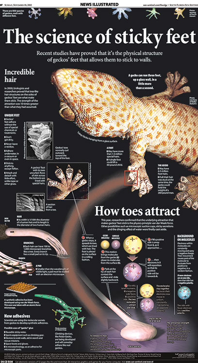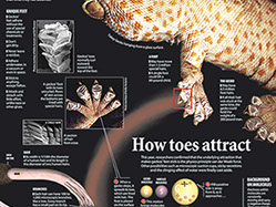 What makes a gecko stick to walls? The truth is gecko's feet aren't sticky at all. Small hair-like structures have a negative/