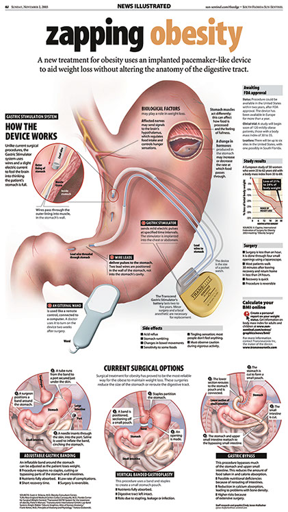 A useful tool against obesity awaits FDA approval. A pacemaker for the stomach helps reduce appetite. Graphic also shows current surgical options and respective side effects.
